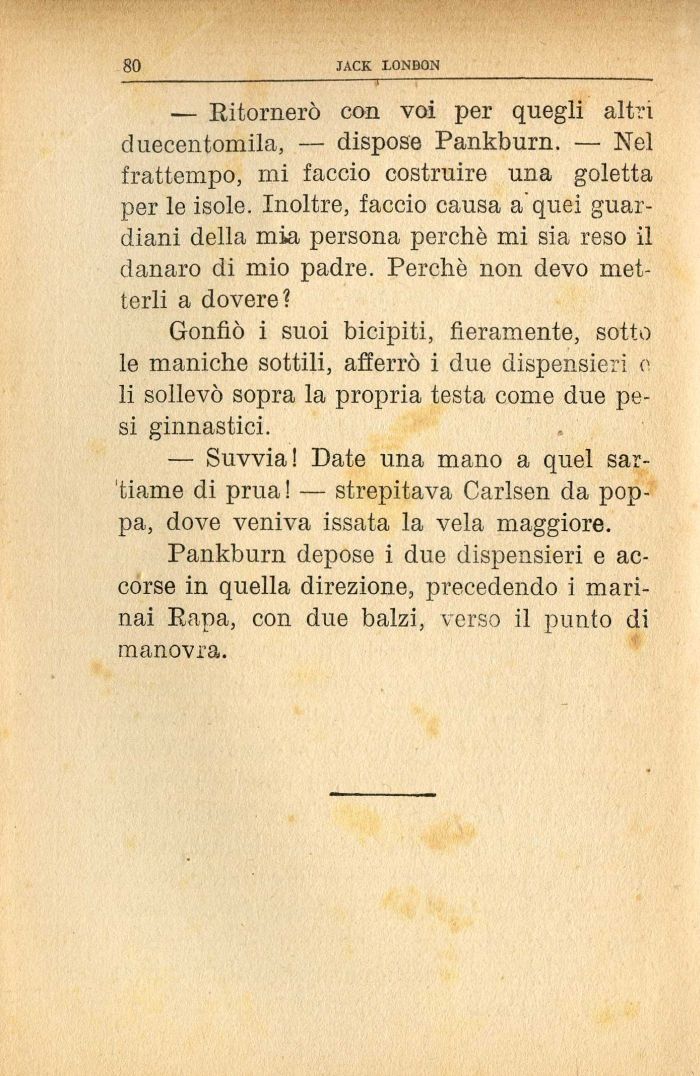 — Ritornerò con voi per quegli altri duecentomila, — dispose Pankburn. — Nel frattempo, mi faccio costruire una goletta per le isole. Inoltre, faccio causa a'quei guardiani della mia persona perchè mi sia reso il danaro di mio padre. Perchè non devo metterli a dovere?