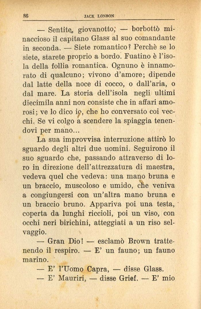 — Sentito, giovanotto; — borbottò minaccioso il capitano Glass al suo comandante in seconda. — Siete romantico? Perchè se lo siete, starete proprio a bordo. Fuatino è l'isola della follia romantica. Ognuno è innamorato di qualcuno; vivono d'amore; dipende dal latte della noce di cocco, o dall'aria, o dal mare. La storia dell'isola negli ultimi diecimila anni non consiste che in affari amorosi ; ve lo dico i^, che ho conversato coi vecchi. Se vi colgo a scendere la spiaggia tenendovi per mano...