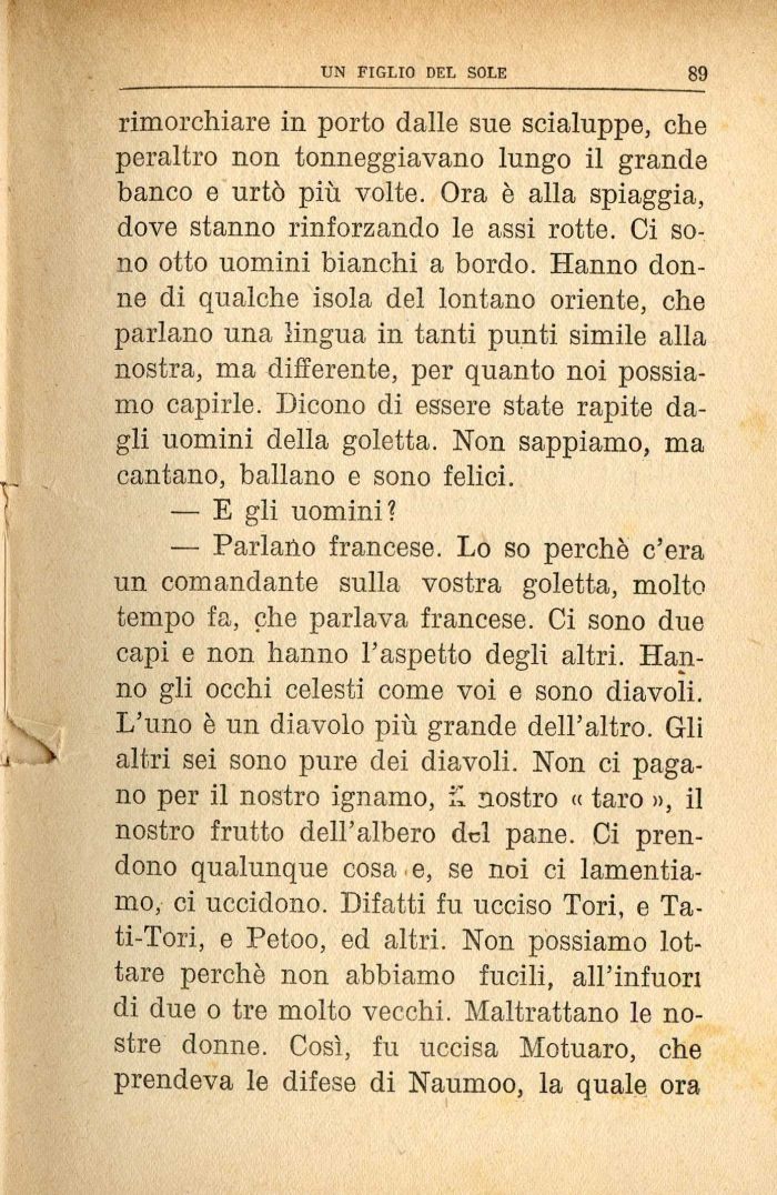 — Parlano francese. Lo so perchè c'era un comandante sulla vostra goletta, molto tempo fa, che parlava francese. Ci sono due capi e non hanno l'aspetto degli altri. Hanno gli occhi celesti come voi e sono diavoli. L'uno è un diavolo più grande dell'altro. Gli altri sei sono pure dei diavoli. Non ci pagano per il nostro ignamo, il nostro « taro », il nostro frutto dell'albero del pane. Ci prendono qualunque cosa e, se noi ci lamentiamo, ci uccidono. Difatti fu ucciso Tori, e Tati-Tori, e Petoo, ed altri. Non possiamo lottare perchè non abbiamo fucili, all'infuori di due o tre molto vecchi. Maltrattano le nostre donne. Così, fu uccisa Motuaro, che prendeva le difese di Naumoo, la quale ora