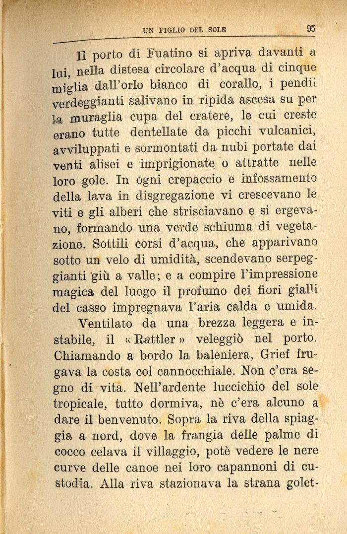 Ventilato da una brezza leggera e instabile, il « Rattler » veleggiò nel porto. Chiamando a bordo la baleniera, Grief frugava la costa col cannocchiale. Non c'era segno di vita. Nell'ardente luccichio del sole tropicale, tutto dormiva, nè c'era alcuno a dare il benvenuto. Sopra la riva della spiaggia a nord, dove la frangia delle palme di cocco celava il villaggio, potè vedere le nere curve delle canoe nei loro capannoni di custodia. Alla riva stazionava la strana golet-