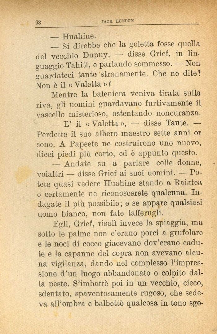 — Si direbbe che la goletta fosse quella del vecchio Dupuy, — disse Grief, in linguaggio Tahiti, e parlando sommesso. — Non guardateci tanto'stranamente. Che ne dite? Non è il « Valetta » ?