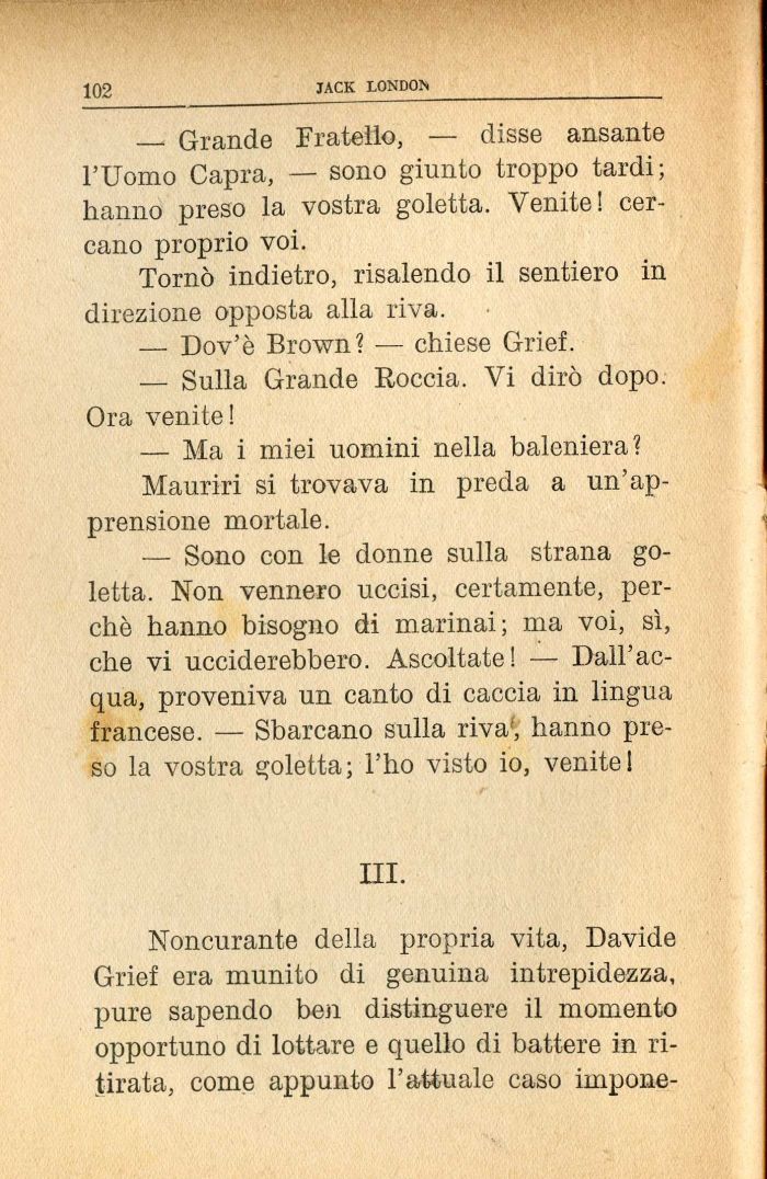— Grande Fratello, — disse ansante l'Uomo Capra, — sono giunto troppo tardi; hanno preso la vostra goletta. Venite! cercano proprio voi.