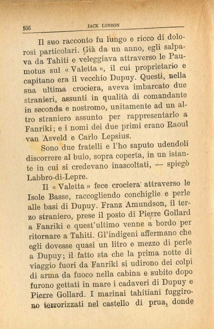 Il suo racconto fu lungo e ricco di dolorosi particolari. Già da un anno, egli salpava da Tahiti e veleggiava attraverso le Pau-motus sul « Valetta », il cui proprietario e capitano era il vecchio Dupuy. Questi, nella sua ultima crociera, aveva imbarcato due stranieri, assunti in qualità di comandante in seconda e nostromo, unitamente ad un altro straniero assunto per rappresentarlo a Fanriki; e i nomi dei due primi erano Raoul van Asveld e Carlo Lepsius.