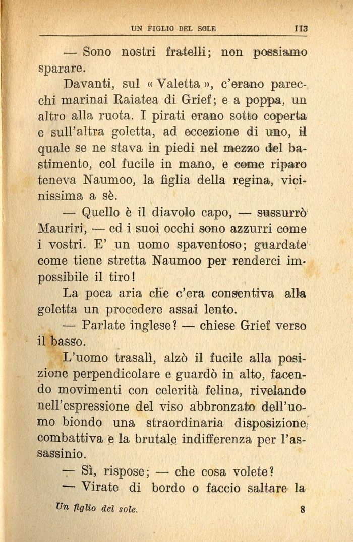 Davanti, sul « Valetta », c'erano parec-, chi marinai Raiatea di Grief; e a poppa, un altro alla ruota. I pirati erano sotto coperta e sull'altra goletta, ad eccezione di uno, il quale se ne stava in piedi nel mezzo del bastimento, col fucile in mano, e come riparo teneva Naumoo, la figlia della regina, vicinissima a sè.