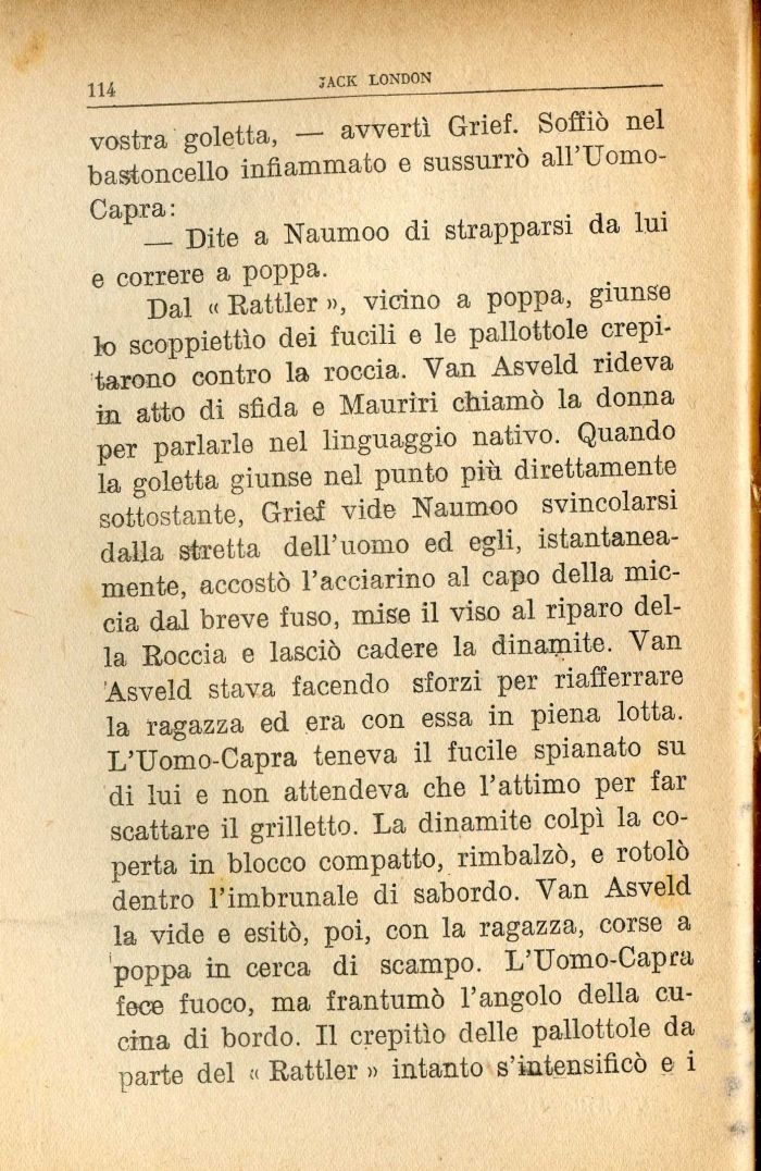 Dal « Rattler », vicino a poppa, giunse lo scoppiettìo dei fucili e le pallottole crepitarono contro la roccia. Van Asveld rideva in atto di sfida e Mauriri chiamò la donna per parlarle nel linguaggio nativo. Quando la goletta giunse nel punto più direttamente sottostante, Grief vide Naumoo svincolarsi dalla stretta dell'uomo ed egli, istantaneamente, accostò l'acciarino al capo della miccia dal breve fuso, mise il viso al riparo della Roccia e lasciò cadere la dinamite. Van Asveld stava facendo sforzi per riafferrare la ragazza ed era con essa in piena lotta. L'Uomo-Capra teneva il fucile spianato su di lui e non attendeva che l'attimo per far scattare il grilletto. La dinamite colpì la coperta in blocco compatto, rimbalzò, e rotolò dentro l'imbrunale di sabordo. Van Asveld la vide e esitò, poi, con la ragazza, corse a poppa in cerca di scampo. L'Uomo-Capra fece fuoco, ma frantumò l'angolo della cucina di bordo. Il crepitìo delle pallottole da parte del « Rattler » intanto s'intensificò e i