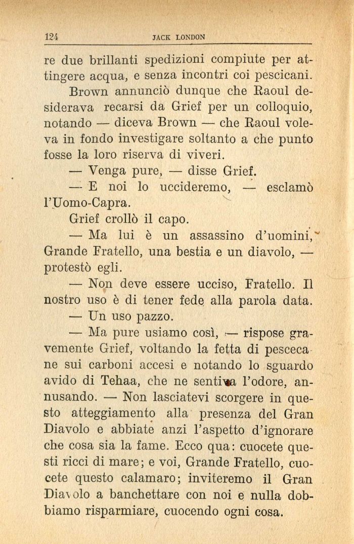 — Ma pure usiamo così, .— rispose gravemente Grief, voltando la fetta di pesceca ne sui carboni accesi e notando lo sguardo avido di Tehaa, che ne sentiwi l'odore, annusando. — Non lasciatevi scorgere in questo atteggiamento alla presenza del Gran Diavolo e abbiate anzi l'aspetto d'ignorare che cosa sia la fame. Ecco qua: cuocete questi ricci di mare ; e voi, Grande Fratello, cuocete questo calamaro; inviteremo il Gran Diavolo a banchettare con noi e nulla dobbiamo risparmiare, cuocendo ogni cosa.