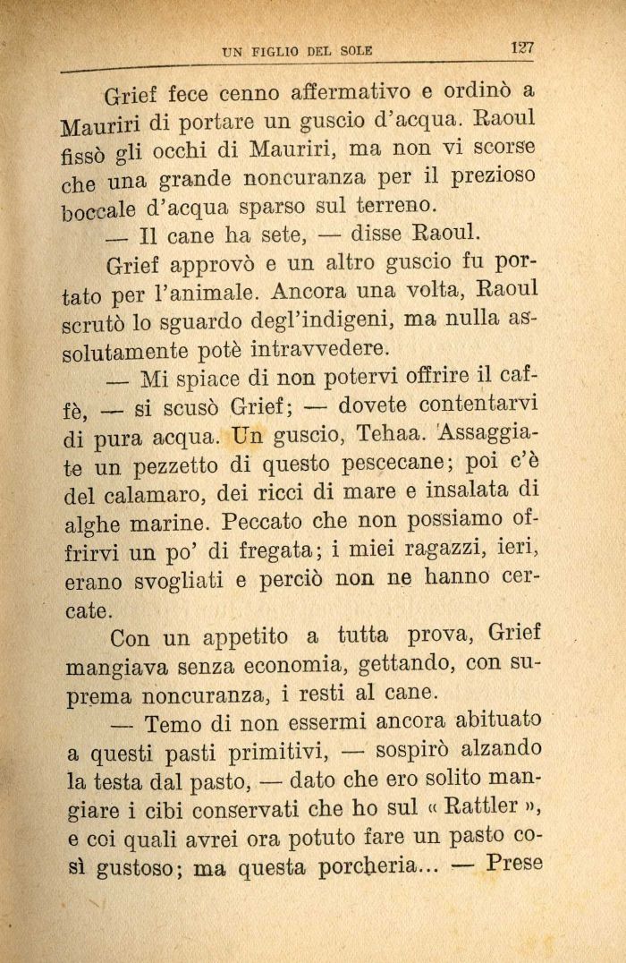 — Mi spiace di non potervi offrire il caffè, — si scusò Grief; — dovete contentarvi di pura acqua. Un guscio, Tehaa. Assaggiate un pezzetto di questo pescecane; poi c'è del calamaro, dei ricci di mare e insalata di alghe marine. Peccato che non possiamo offrirvi un po' di fregata; i miei ragazzi, ieri, erano svogliati e perciò non ne hanno cercate.