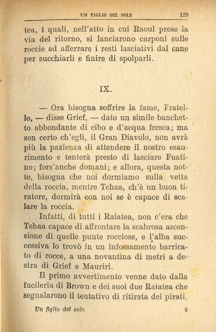 — Ora bisogna soffrire la fame, Fratello, — disse Grief, — dato un simile banchetto abbondante di cibo e d'acqua fresca; ma son certo ch'egli, il Gran Diavolo, non avrà più la pazienza di attendere il nostro esaurimento e tenterà presto di lasciare Fuati-no; fors'anche domani; e allora, questa notte, bisogna che noi dormiamo sulla vetta della roccia, mentre Tehaa, ch'è un buon tiratore, dormirà con noi se è capace di scalare la roccia.