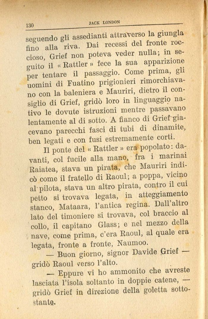 seguendo gli assedianti attraverso la giungla fino alla riva. Dai recessi del fronte roccioso, Grief non poteva veder nulla; in seguito il « Rattler » fece la sua apparizione per tentare il passaggio. Come prima, gli uomini di Fuatino prigionieri rimorchiavano con la baleniera e Mauriri, dietro il consiglio di Grief, griḍ loro in linguaggio nativo le dovute istruzioni mentre passavano lentamente al di sotto. A fianco di Grief-gia-cevano parecchi fasci di tubi di dinamite5 ben legati e con fusi estremamente corti.