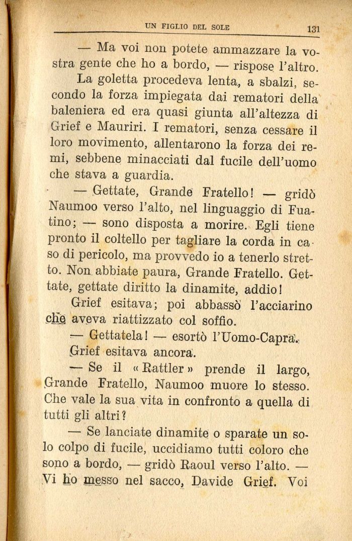 — Gettate, Grande Fratello! — griḍ Naumoo verso l'alto, nel linguaggio di Fuatino; — sono disposta a morire. Egli tiene pronto il coltello per tagliare la corda in caso di pericolo, ma provvedo io a tenerlo stretto. Non abbiate paura, Grande Fratello. Gettate, gettate diritto la dinamite, addio!