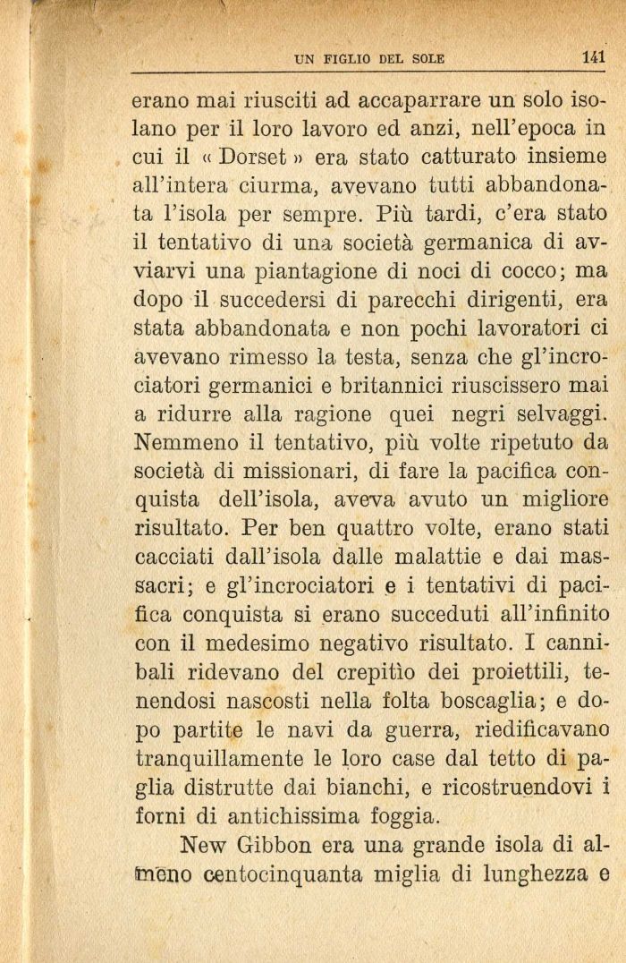 erano mai riusciti ad accaparrare un solo isolano per il loro lavoro ed anzi, nell'epoca in cui il « Dorset » era stato catturato insieme all'intera ciurma, avevano tutti abbandonata l'isola per sempre. Più tardi, c'era stato il tentativo di una società germanica di avviarvi una piantagione di noci di cocco; ma dopo il succedersi di parecchi dirigenti, era stata abbandonata e non pochi lavoratori ci avevano rimesso la testa, senza che gl'incrociatori germanici e britannici riuscissero mai a ridurre alla ragione quei negri selvaggi. Nemmeno il tentativo, più volte ripetuto da società di missionari, di fare la pacifica conquista dell'isola, aveva avuto un migliore risultato. Per ben quattro volte, erano stati cacciati dall'isola dalle malattie e dai massacri; e gl'incrociatori e i tentativi di pacifica conquista si erano succeduti all'infinito con il medesimo negativo risultato. I cannibali ridevano del crepitìo dei proiettili, tenendosi nascosti nella folta boscaglia; e dopo partite le navi da guerra, riedificavano tranquillamente le loro case dal tetto di paglia distrutte dai bianchi, e ricostruendovi i forni di antichissima foggia.