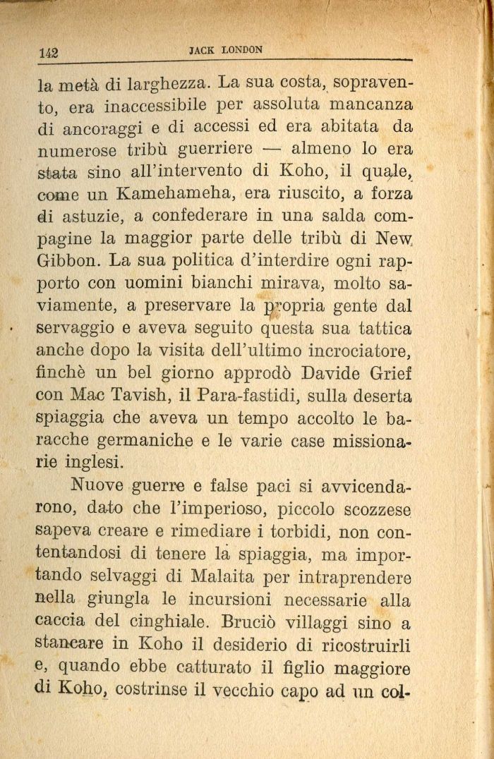 la metà di larghezza. La sua costa, sopravento, era inaccessibile per assoluta mancanza di ancoraggi e di accessi ed era abitata da numerose tribù guerriere — almeno lo era stata sino all'intervento di Koho, il quale, come un Kamehameha, era riuscito, a forza di astuzie, a confederare in una salda compagine la maggior parte delle tribù di New, Gibbon. La sua politica d'interdire ogni rapporto con uomini bianchi mirava, molto saviamente, a preservare la ^opria gente dal servaggio e aveva seguito questa sua tattica anche dopo la visita dell'ultimo incrociatore, finché un bel giorno approdò Davide Grief con Mac Tavish, il Para-fastidi, sulla deserta spiaggia che aveva un tempo accolto le baracche germaniche e le varie case missionarie inglesi.