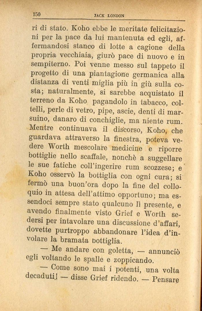 ri di stato. Koho ebbe le meritate felicitazioni per la pace da lui mantenuta ed egli, affermandosi stanco di lotte a cagione della propria vecchiaia, giurò pace di nuovo e in sempiterno. Poi venne messo sul tappeto il progetto di una piantagione germanica alla distanza di venti miglia più in giù sulla costa; naturalmente, si sarebbe acquistato il terreno da Koho pagandolo in tabacco, coltelli, perle di vetro, pipe, ascie, denti di marsuino, danaro di conchiglie, ma niente rum. Mentre continuava il discorso, Koho, che guardava attraverso la finestra, poteva vedere Worth mescolare medicine e riporre bottiglie nello scaffale, nonché a suggellare le sue fatiche coll'ingerire rum scozzese; e Koho osservò la bottiglia con ogni cura; si fermò una buon'ora dopo la fine del colloquio in attesa dell'attimo opportuno; ma essendoci sempre stato qualcuno lì presente, e avendo finalmente visto Grief e Worth sedersi per intavolare una discussione d'affari, dovette purtroppo abbandonare l'idea d'involare la bramata bottiglia.