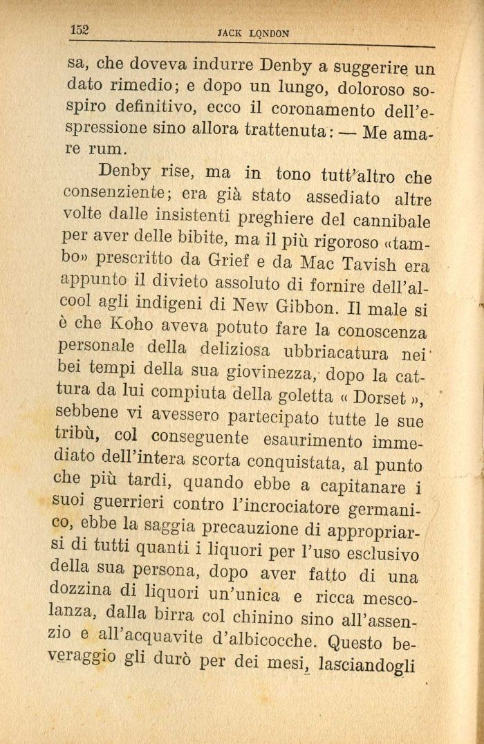 Denby rise, ma in tono tutt'altro che consenziente; era già stato assediato altre volte dalle insistenti preghiere del cannibale per aver delle bibite, ma il più rigoroso «tam-bo» prescritto da Grief e da Mac Tavish era appunto il divieto assoluto di fornire dell'alcool agli indigeni di New Gibbon. Il male si ò che Koho aveva potuto fare la conoscenza personale della deliziosa ubbriacatura nei' bei tempi della sua giovinezza, dopo la cattura da lui compiuta della goletta « Dorset », sebbene vi avessero partecipato tutte le sue tribù, col conseguente esaurimento immediato dell'intera scorta conquistata, al punto che più tardi, quando ebbe a capitanare i suoi guerrieri contro l'incrociatore germanico, ebbe la saggia precauzione di appropriarsi di tutti quanti i liquori per l'uso esclusivo della sua persona, dopo aver fatto di una dozzina di liquori un'unica e ricca mescolanza, dalla birra col chinino sino all'assenzio e all'acquavite d'albicocche. Questo beveraggio gli durò per dei mesi, lasciandogli