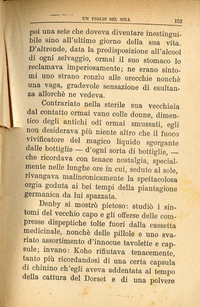 poi una sete che doveva diventare inestinguibile sino all'ultimo giorno della sua vita. D'altronde, data la predisposizione all'alcool di ogni selvaggio, ormai il suo stomaco lo reclamava imperiosamente; ne erano sintomi uno strano ronzìo alle orecchie nonché una vaga, gradevole sensazione di esultanza allorché ne vedeva.