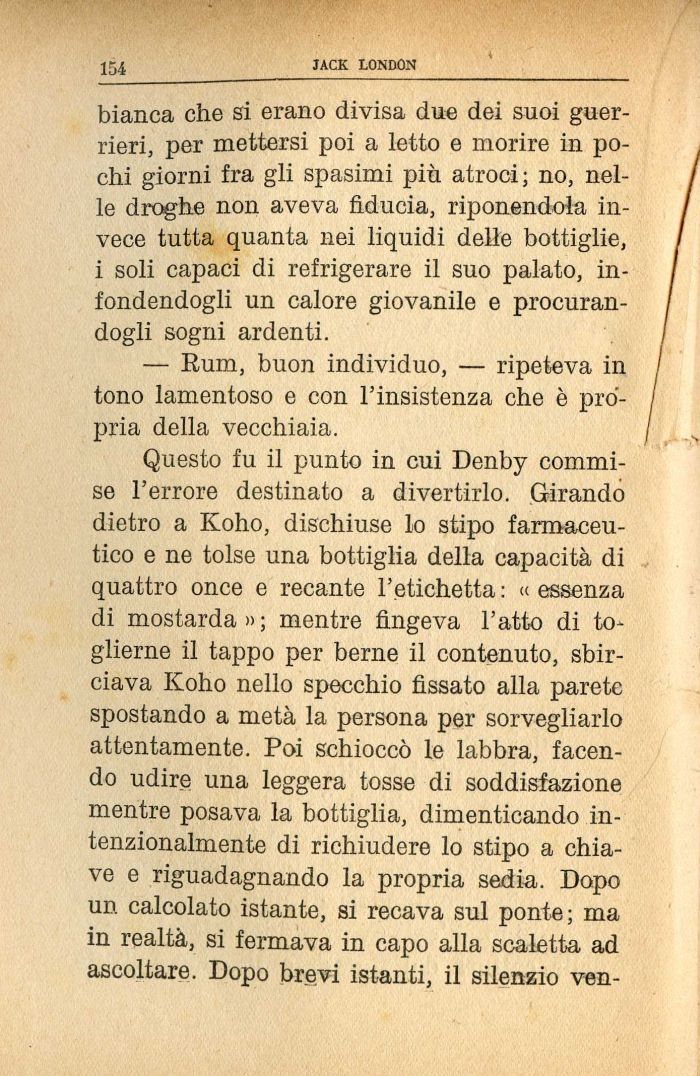 Questo fu il punto in cui Denby commise l'errore destinato a divertirlo. Girando dietro a Koho, dischiuse lo stipo farmaceutico e ne tolse una bottiglia della capacità di quattro once e recante l'etichetta : « essenza di mostarda»; mentre fingeva l'atto di toglierne il tappo per berne il contenuto, sbirciava Koho nello specchio fissato alla parete spostando a metà la persona per sorvegliarlo attentamente. Poi schioccò le labbra, facendo udire una leggera tosse di soddisfazione mentre posava la bottiglia, dimenticando intenzionalmente di richiudere lo stipo a chiave e riguadagnando la propria sedia. Dopo un calcolato istante, si recava sul ponte; ma in realtà, si fermava in capo alla scaletta ad ascoltare. Dopo brevi istanti, il silenzio ven-