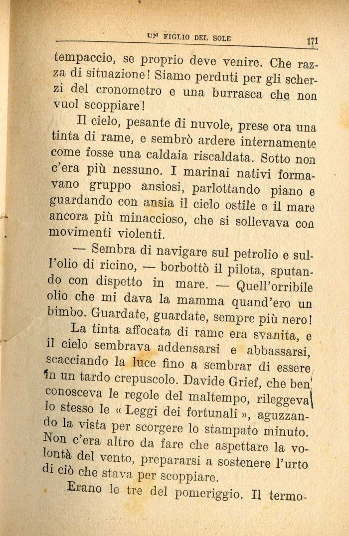 La tinta affocata di rame era svanita, e il cielo sembrava addensarsi e abbassarsi, scacciando la luce fino a sembrar di essere 1n un tardo crepuscolo. Davide Grief, che beh conosceva le regole del maltempo, rileggeva\ lo stesso le « Leggi dei fortunali », aguzzando la vista per scorgere lo stampato minuto. Non c'era altro da fare che aspettare la volontà del vento, prepararsi a sostenere l'urto di ciò che stava per scoppiare.
