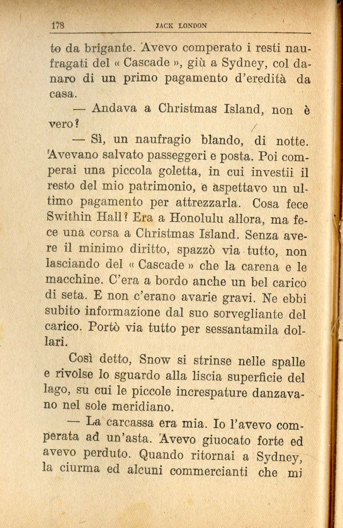 — Sì, un naufragio blando, di notte. Avevano salvato passeggeri e posta. Poi comperai una piccola goletta, in cui investii il resto del mio patrimonio, e aspettavo un ultimo pagamento per attrezzarla. Cosa fece Swithin Hall? Era a Honolulu allora, ma fece una corsa a Christmas Island. Senza avere il minimo diritto, spazzò via tutto, non lasciando del « Cascade » che la carena e le macchine. C'era a bordo anche un bel carico di seta. E non c'erano avarie gravi. Ne ebbi subito informazione dal suo sorvegliante del carico. Portò via tutto per sessantamila dollari.