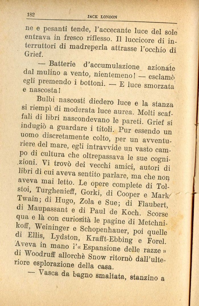 Bulbi nascosti diedero luce e la stanza si riempì di moderata luce aurea. Molti scaffali di libri nascondevano le pareti. Grief si indugiò a guardare i titoli. Pur essendo un uomo discretamente colto, per un avventuriere del mare, egli intravvide un vasto campo di cultura che oltrepassava le sue cognizioni. Vi trovò dei vecchi amici, autori di libri di cui aveva sentito parlare, ma che noij aveva mai letto. Le opere complete di Tol-stoi, Turghenieff, Gorki, di Cooper e Mark Twain; di Hugo, Zola e Sue; di Flaubert, di Maupassant e di Paul de Koch. Scorse qua e là con curiosità le pagine di Metchni-koff, Weininger e Schopenhauer, poi quelle di Ellis, Lydston, Krafft-Ebbing e Forel. Aveva in mano i'« Espansione delle razze » di Woodruff allorché Snow ritornò dall'ulteriore esplorazione della casa.