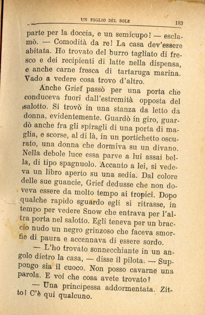 Anche Grief pasṣ per una porta che conduceva fuori dall'estremità opposta del (Salotto. Si troṿ in una stanza da letto da donna, evidentemente. Guarḍ in giro, guarḍ anche fra gli spiragli di una porta di maglia, e scorse, al di là, in un portichetto oscurato, una donna che dormiva su un divano. Nella debole luce essa parve a lui assai bella, di tipo spagnuolo. Accanto a lei, si vedeva un libro aperto su una sedia. Dal colore delle sue guancie, Grief dedusse che non doveva essere eia molto tempo ai tropici. Dopo qualche rapido sguardo egli si ritrasse, in tempo per vedere Snow che entrava per l'altra porta nel salotto. Egli teneva per un braccio nudo un negro grinzoso che faceva smorfie di paura e accennava di essere sordo.