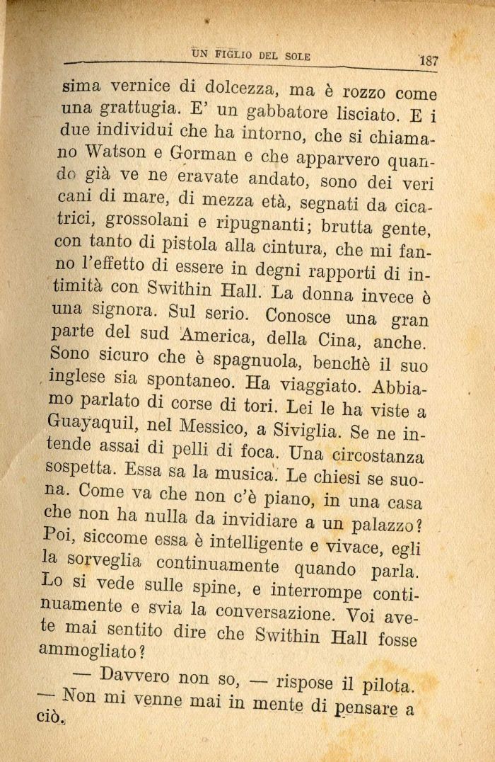sima vernice di dolcezza, ma è rozzo come una grattugia. E' un gabbatore lisciato. E i due individui che ha intorno, che si chiamano Watson e Gorman e che apparvero quando già ve ne eravate andato, sono dei veri cani di mare, di mezza età, segnati da cicatrici, grossolani e ripugnanti; brutta gente, con tanto di pistola alla cintura, che mi fanno l'effetto di essere in degni rapporti di intimità con Swithin Hall. La donna invece è una signora. Sul serio. Conosce una gran parte del sud America, della Cina, anche. Sono sicuro che è spagnuola, benché il suo inglese sia spontaneo. Ha viaggiato. Abbiamo parlato di corse di tori. Lei le ha viste a Guayaquil, nel Messico, a Siviglia. Se ne intende assai di pelli di foca. Una circostanza sospetta. Essa sa la musica. Le chiesi se suona. Come va che non c'è piano, in una casa che non ha nulla da invidiare a un palazzo? Poi, siccome essa è intelligente e vivace, egli la sorveglia continuamente quando parla. Lo si vede sulle spine, e interrompe continuamente e svia la conversazione. Voi avete mai sentito dire che Swithin Hall fosse ammogliato ?