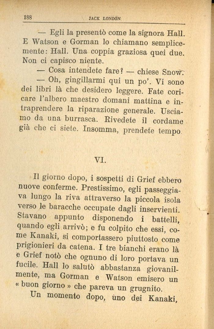 Il giorno dopo, i sospetti di Grief ebbero nuove conferme. Prestissimo, egli passeggiava lungo la riva attraverso la piccola isola verso le baracche occupate dagli inservienti. Stavano appunto disponendo i battelli, quando egli arriṿ; e fu colpito che essi, come Kanaki, si comportassero piuttosto come prigionieri da catena. I tre bianchi erano là è Grief noṭ che ognuno di loro portava un fucile. Hall lo saluṭ abbastanza giovanilmente, ma Gorman e Watson emisero un « buon giorno » che pareva un grugnito.