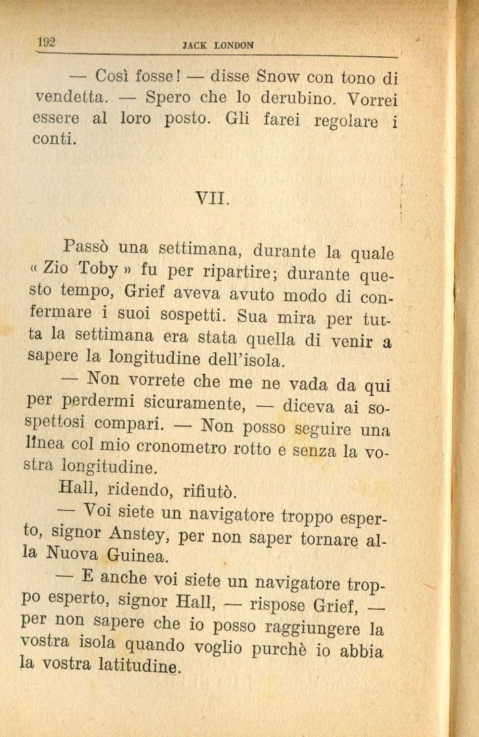 Passò una settimana, durante la quale « Zio Toby » fu per ripartire ; durante questo tempo, Grief aveva avuto modo di confermare i suoi sospetti. Sua mira per tutta la settimana era stata quella di venir a sapere la longitudine dell'isola.