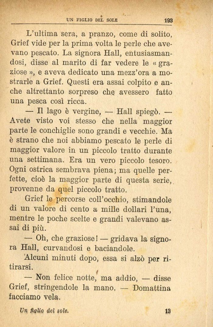 L'ultima sera, a pranzo, come di solito, Grief vide per la prima volta le perle che avevano pescato. La signora Hall, entusiasmandosi, disse al marito di far vedere le « graziose », e aveva dedicato una mezz'ora a mostrarle a Grief. Questi era assai colpito e anche altrettanto sorpreso che avessero fatto una pesca così ricca.