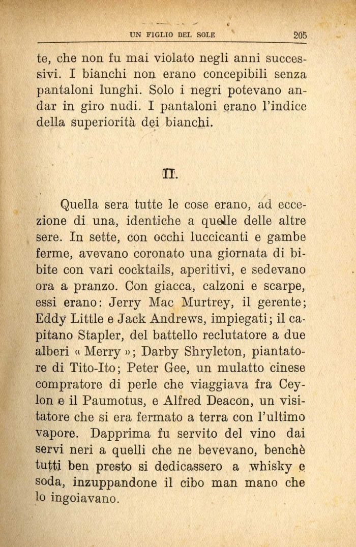 Quella sera tutte le cose erano, ad eccezione di una, identiche a quelle delle altre sere. In sette, con occhi luccicanti e gambe ferme, avevano coronato una giornata di bibite con vari cocktails, aperitivi, e sedevano ora a pranzo. Con giacca, calzoni e scarpe, essi erano: Jerry Mac Murtrey, il gerente; Eddy Little e Jack Andrews, impiegati; il capitano Stapler, del battello reclutatore a due alberi « Merry » ; Darby Shryleton, piantatore di Tito-Ito; Peter Gee, un mulatto cinese compratore di perle che viaggiava fra Cey-lon e il Paumotus, e Alfred Deacon, un visitatore che si era fermato a terra con l'ultimo vapore. Dapprima fu servito del vino dai servi neri a quelli che ne bevevano, benché tutti ben presto si dedicassero a whisky e soda, inzuppandone il cibo man mano che lo ingoiavano.