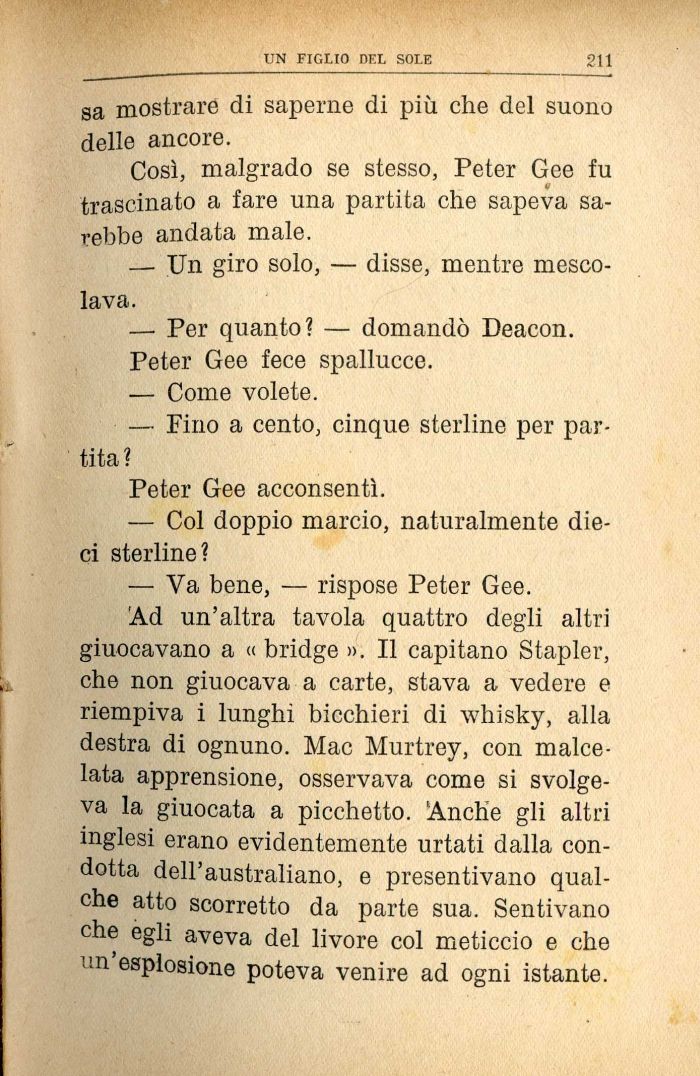 'Ad un'altra tavola quattro degli altri giuocavano a « bridge ». Il capitano Stapler, che non giuocava a carte, stava a vedere e riempiva i lunghi bicchieri di whisky, alla destra di ognuno. Mac Murtrey, con malcelata apprensione, osservava come si svolgeva la giuocata a picchetto. Anche gli altri inglesi erano evidentemente urtati dalla condotta dell'australiano, e presentivano qualche atto scorretto da parte sua. Sentivano che egli aveva del livore col meticcio e che un esplosione poteva venire ad ogni istante.