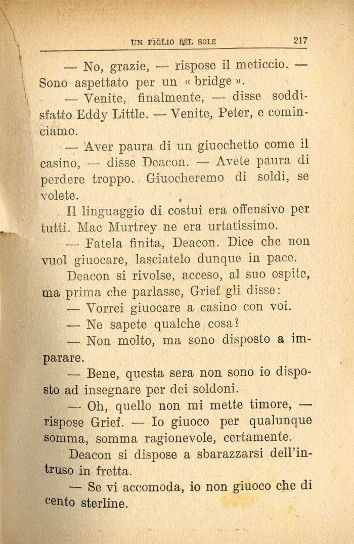 — Aver paura di un giuochetto come il casino, — disse Deacon. — Avete paura di perdere troppo. Giuocheremo eli soldi, se volete.