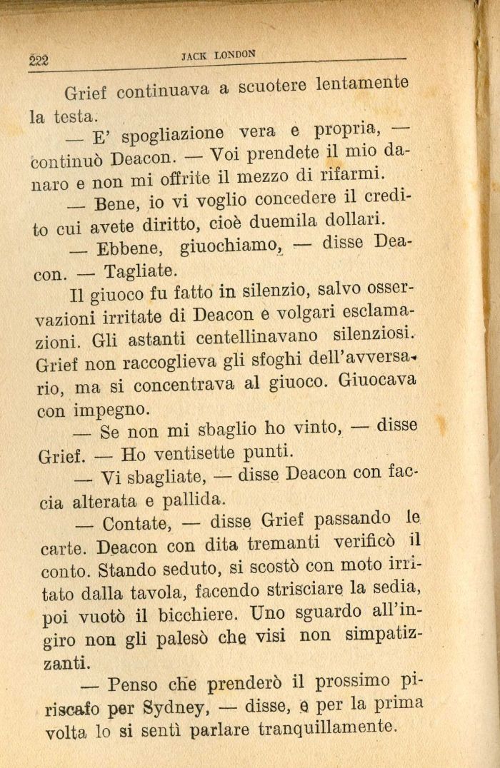 — Contate, — disse Grief passando le carte. Deacon con dita tremanti verificò il conto. Stando seduto, si scostò con moto irritato dalla tavola, facendo strisciare la sedia, poi vuotò il bicchiere. Uno sguardo all'ingiro non gli palesò che visi non simpatizzanti.