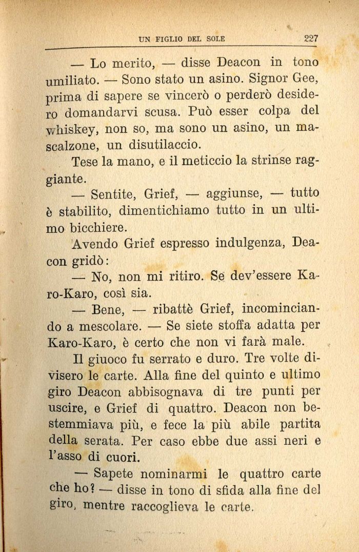 — Bene, — ribattè Grief, incominciando a mescolare. — Se siete stoffa adatta per Karo-Karo, è certo che non vi farà male.