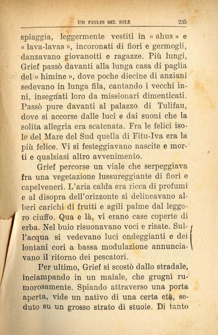 spiaggia, leggermente vestiti in « ahus » e (( lava-lavas », incoronati di fiori e germogli, danzavano giovanotti e ragazze. Più lungi, Grief passò davanti alla lunga casa di paglia del « himine », dove poche diecine di anziani sedevano in lunga fila, cantando i vecchi inni, insegnati loro da missionari dimenticati. Passò pure davanti al palazzo di Tulifau, dove si accorse dalle luci e dai suoni che la solita allegria era scatenata. Fra le felici isole del Mare del Sud quella di Fitu-Iva era la più felice. Vi si festeggiavano nascite e morti e qualsiasi altro avvenimento.