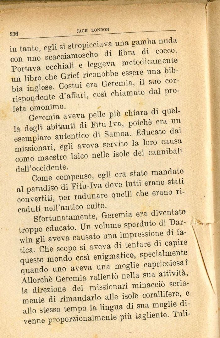 Sfortunatamente, Geremia era diventato troppo educato. Un volume sperduto di Darwin gli aveva causato una impressione di fatica. Che scopo si aveva di tentare di capire questo mondo così enigmatico, specialmente quando uno aveva una moglie capricciosa? Allorché Geremia rallentò nella sua attività, la direzione dei missionari minacciò seriamente di rimandarlo alle isole corallifere, c allo stesso tempo la lingua di sua moglie divenne proporzionalmente più tagliente. Tuli-