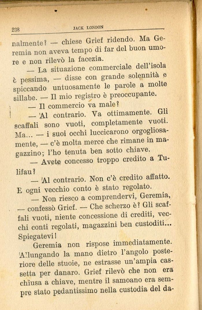 — Non riesco a comprendervi, Geremia, — confessò Grief. — Che scherzo è? Gli scaffali vuoti, niente concessione di crediti, vecchi conti regolati, magazzini ben custoditi... Spiegatevi !