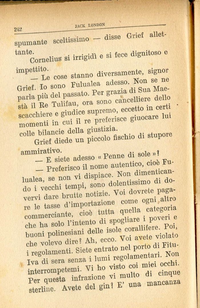 — Preferisco il nome autentico, cioè Fulualea, se non vi dispiace. Non dimenticando i vecchi tempi, sono dolentissimo di dovervi dare brutte notizie. Voi dovrete pagare le tasse d'importazione come ogni altro commerciante, cioè tutta quella categoria che ha solo l'intento di spogliare i poveri e buoni polinesiani delle isole corallifere. Poi, che volevo dire? Ah, ecco. Voi avete violato i regolamenti. Siete entrato nel porto di Fitu-Iva di sera senza i lumi regolamentari. Non interrompetemi. Vi ho visto coi miei occhi. Per questa infrazione vi multo di cinque sterline. Avete del gin? E' una mancanza