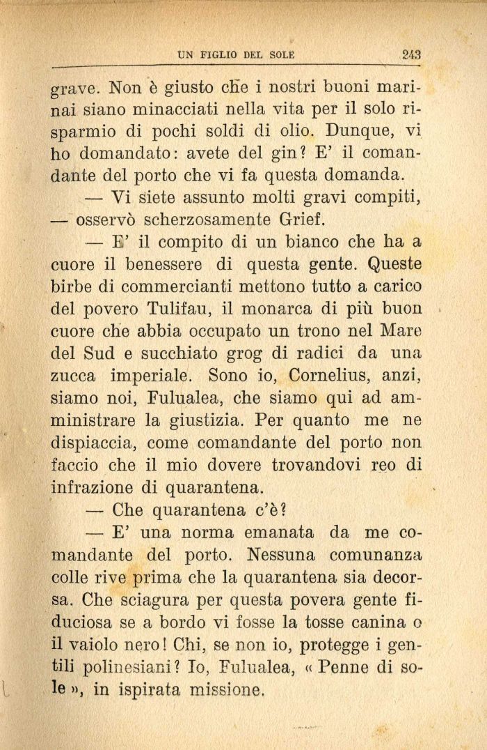 — E' una norma emanata da me comandante del porto. Nessuna comunanza colle rive prima che la quarantena sia decorsa. Che sciagura per questa povera gente fiduciosa se a bordo vi fosse la tosse canina o il vaiolo nero ! Chi, se non io, protegge i gentili polinesiani? Io, Fulualea, «Penne di sole », in ispirata missione.