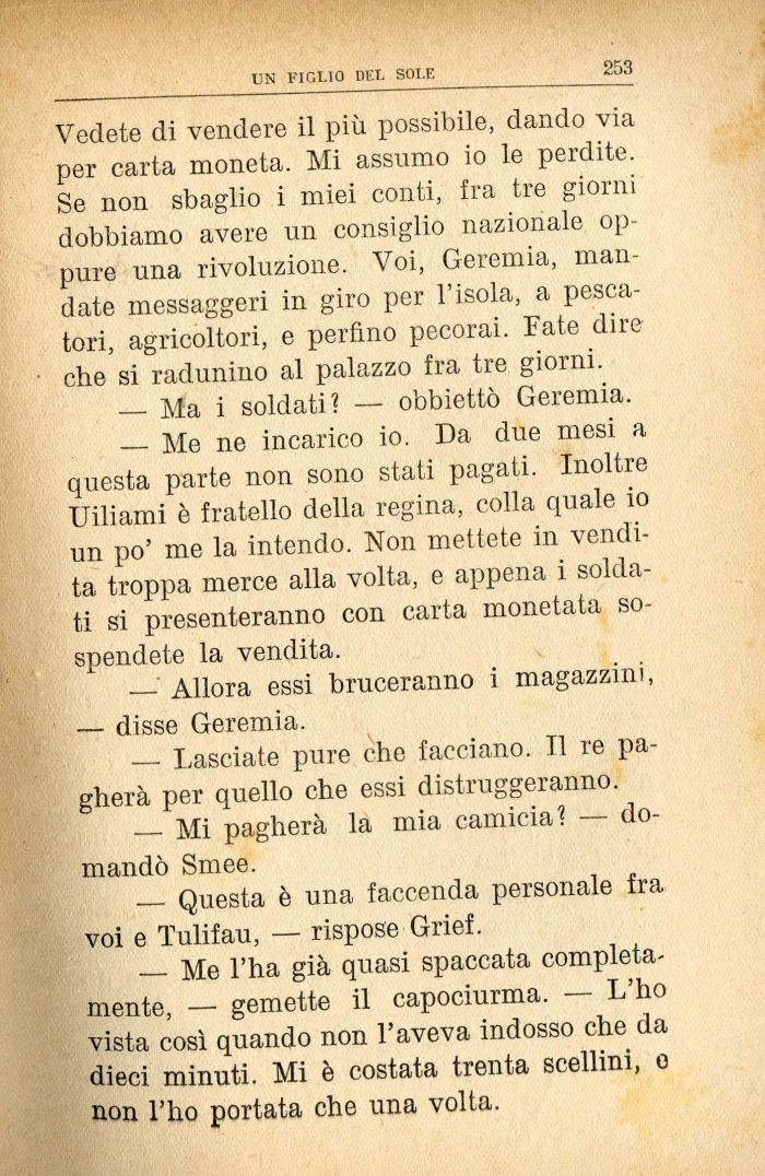 — Me ne incarico io. Da due mesi a questa parte non sono stati pagati. Inoltre Uiliami è fratello della regina, colla quale io un po' me la intendo. Non mettete in vendita troppa merce alla volta, e appena i soldati si presenteranno con carta monetata sospendete la vendita.