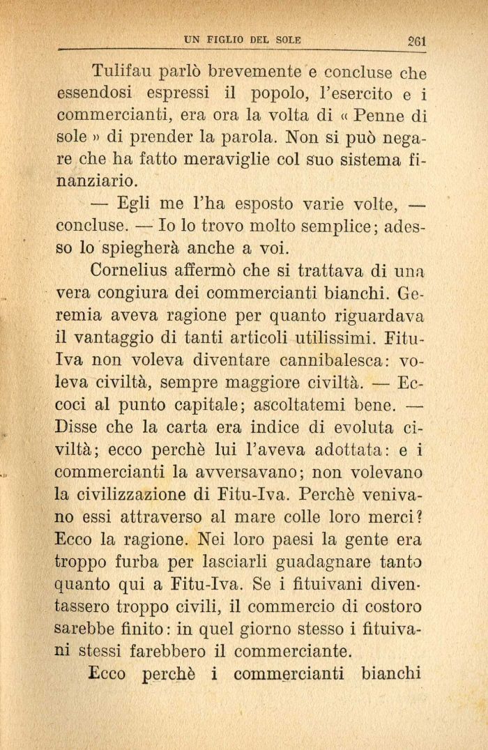 Cornelius affermò che si trattava di una vera congiura dei commercianti bianchi. Geremia aveva ragione per quanto riguardava il vantaggio di tanti articoli utilissimi. Fitu-Iva non voleva diventare cannibalesca: voleva civiltà, sempre maggiore civiltà. — Eccoci al punto capitale; ascoltatemi bene. — Disse che la carta era indice di evoluta civiltà; ecco perchè lui l'aveva adottata: e i commercianti la avversavano; non volevano la civilizzazione di Fitu-Iva. Perchè venivano essi attraverso al mare colle loro merci? Ecco la ragione. Nei loro paesi la gente era troppo furba per lasciarli guadagnare tanto quanto qui a Fitu-Iva. Se i fituivani diventassero troppo civili, il commercio di costoro sarebbe finito : in quel giorno stesso i fituivani stessi farebbero il commerciante.