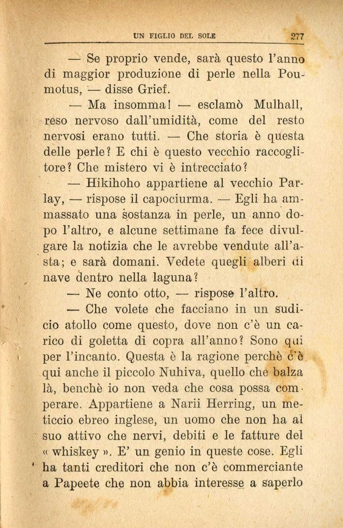 — Hikihoho appartiene al vecchio Par-lay, — rispose il capociurma. — Egli ha ammassato una sostanza in perle, un anno dopo l'altro, e alcune settimane fa fece divulgare la notizia che le avrebbe vendute all'asta; e sarà domani. Vedete quegli alberi di nave dentro nella laguna?