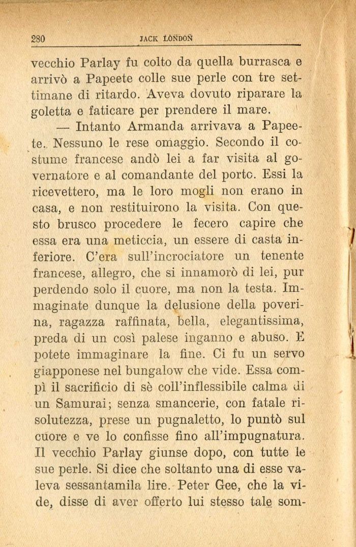— Intanto Armanda arrivava a Papeete. Nessuno le rese omaggio. Secondo il costume francese andò lei a far visita al governatore e al comandante del porto. Essi la ricevettero, ma le loro mogli non erano in casa, e non restituirono la visita. Con questo brusco procedere le fecero capire che essa era una meticcia, un essere di casta inferiore. C'era sull'incrociatore un tenente francese, allegro, che si innamorò di lei, pur perdendo solo il cuore, ma non la testa. Immaginate dunque la delusione della poverina, ragazza raffinata, bella, elegantissima, preda di un così palese inganno e abuso. E potete immaginare la fine. Ci fu un servo giapponese nel bungalow che vide. Essa compì il sacrificio di sè coll'inflessibile calma di un Samurai; senza smancerie, con fatale risolutezza, prese un pugnaletto, lo puntò sul cuore e ve lo confisse fino all'impugnatura. Il vecchio Parlay giunse dopo, con tutte le sue perle. Si dice che soltanto una di esse valeva sessantamila lire. Peter Gee, che la vide, disse di aver offerto lui stesso tale, soni-