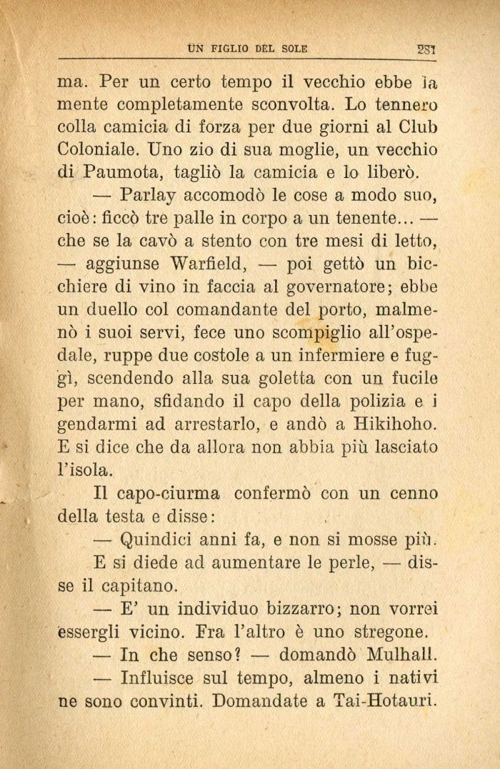 ma. Per un certo tempo il vecchio ebbe la mente completamente sconvolta. Lo tennero colla camicia di forza per due giorni al Club Coloniale. Uno zio di sua moglie, un vecchio di Paumota, tagliò la camicia e lo liberò.