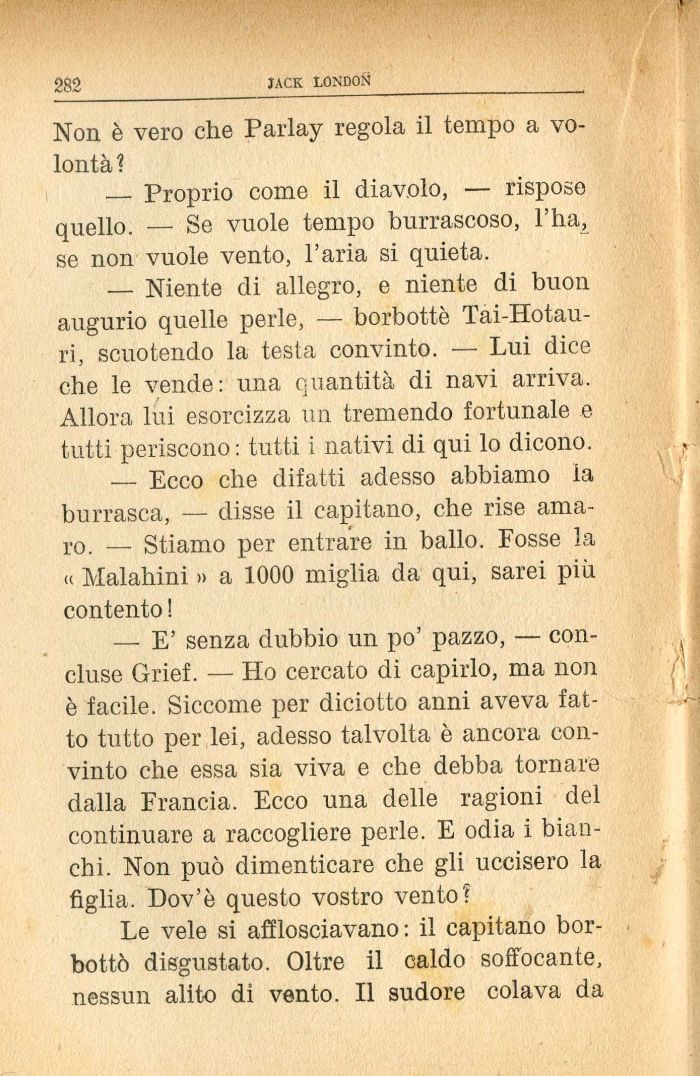 — E' senza dubbio un po' pazzo, — concluse Grief. — Ho cercato di capirlo, ma non è facile. Siccome per diciotto anni aveva fatto tutto per lei, adesso talvolta è ancora convinto che essa sia viva e che debba tornare dalla Francia. Ecco una delle ragioni del continuare a raccogliere perle. E odia i bianchi. Non può dimenticare che gli uccisero la figlia. Dov'è questo vostro vento?