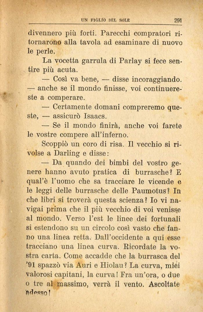 — Da quando dei bimbi del vostro genere hanno avuto pratica di burrasche? E qual'è l'uomo che sa tracciare le vicende e le leggi delle burrasche delle Paumotus? In che libri si troverà questa scienza? Io vi navigai prima che il più vecchio di voi venisse al mondo. Verso l'est le linee dei fortunali si estendono su un circolo così vasto che fanno una linea retta. Dall'occidente a qui esse tracciano una linea curva. Ricordate la vostra carta. Come accadde che la burrasca del '91 spazzò via Auri e Hiolau? La curva, miei valorosi capitani, la curva! Fra un'ora, o due o tre al massimo, verrà il vento. Ascoltate fìdpsso !