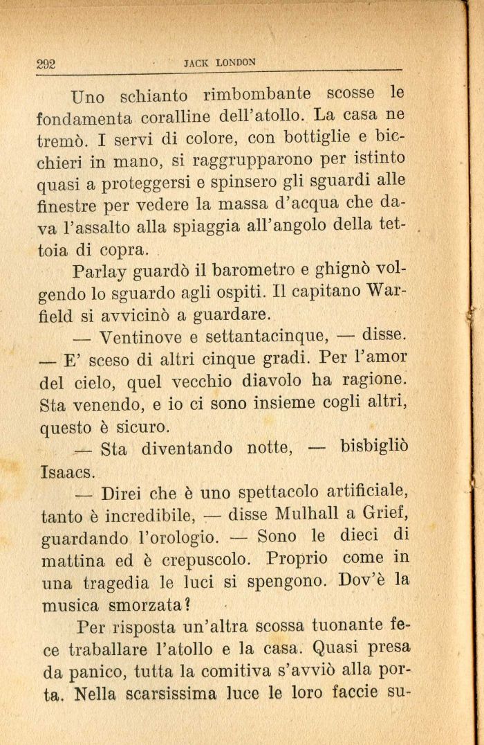 Uno schianto rimbombante scosse le fondamenta coralline dell'atollo. La casa ne tremò. I servi di colore, con bottiglie e bicchieri in mano, si raggrupparono per istinto quasi a proteggersi e spinsero gli sguardi alle finestre per vedere la massa d'acqua che dava l'assalto alla spiaggia all'angolo della tettoia di copra.