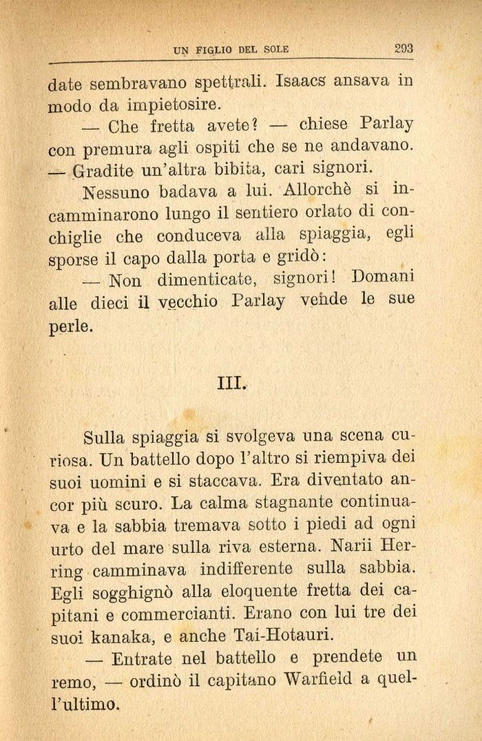 Sulla spiaggia si svolgeva una scena curiosa. Un battello dopo l'altro si riempiva dei suoi uomini e si staccava. Era diventato ancor più scuro. La calma stagnante continuava e la sabbia tremava sotto i piedi ad ogni urto del mare sulla riva esterna. Narii Her-ring camminava indifferente sulla sabbia. Egli sogghignò alla eloquente fretta dei capitani e commercianti. Erano con lui tre dei suoi kanaka, e anche Tai-Hotauri.