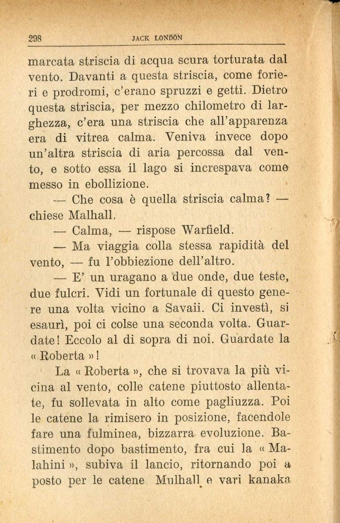 La « Roberta », che si trovava la più vicina al vento, colle catene piuttosto allentate, fu sollevata in alto come pagliuzza. Poi le catene la rimisero in posizione, facendole fare una fulminea, bizzarra evoluzione. Bastimento dopo bastimento, fra cui la « Maialimi », subiva il lancio, ritornando poi a posto per le catene Mulhall e vari kanaka
