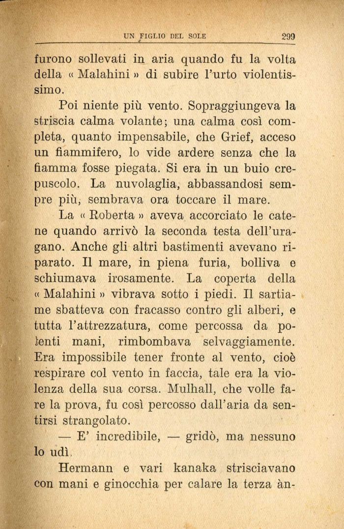 La « Roberta » aveva accorciato le catene quando arrivò la seconda testa dell'uragano. Anche gli altri bastimenti avevano riparato. Il mare, in piena furia, bolliva e schiumava irosamente. La coperta della « Malahini » vibrava sotto i piedi. Il sartiame sbatteva con fracasso contro gli alberi, e tutta l'attrezzatura, come percossa da po-ìenti mani, rimbombava selvaggiamente. Era impossibile tener fronte al vento, cioè respirare col vento in faccia, tale era la violenza della sua corsa. Mulhall, che volle fare la prova, fu così percosso dall'aria da sentirsi strangolato.