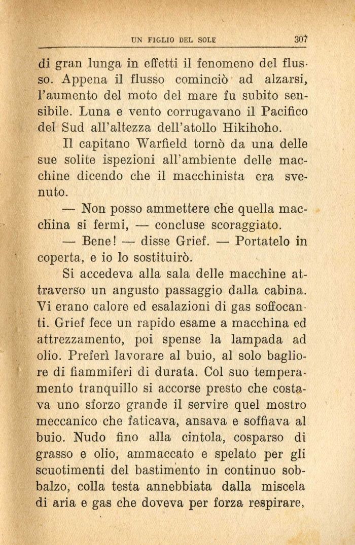 Si accedeva alla sala delle macchine attraverso un angusto passaggio dalla cabina. Vi erano calore ed esalazioni di gas soffocali ti. Grief fece un rapido esame a macchina ed attrezzamento, poi spense la lampada ad olio. Preferì lavorare al buio, al solo bagliore di fiammiferi di durata. Col suo temperamento tranquillo si accorse presto che costava uno sforzo grande il servire quel mostro meccanico che faticava, ansava e soffiava al buio. Nudo fino alla cintola, cosparso di grasso e olio, ammaccato e spelato per gli scuotimenti del bastimento in continuo sobbalzo, colla testa annebbiata dalla miscela di aria e gas che doveva per forza respirare,